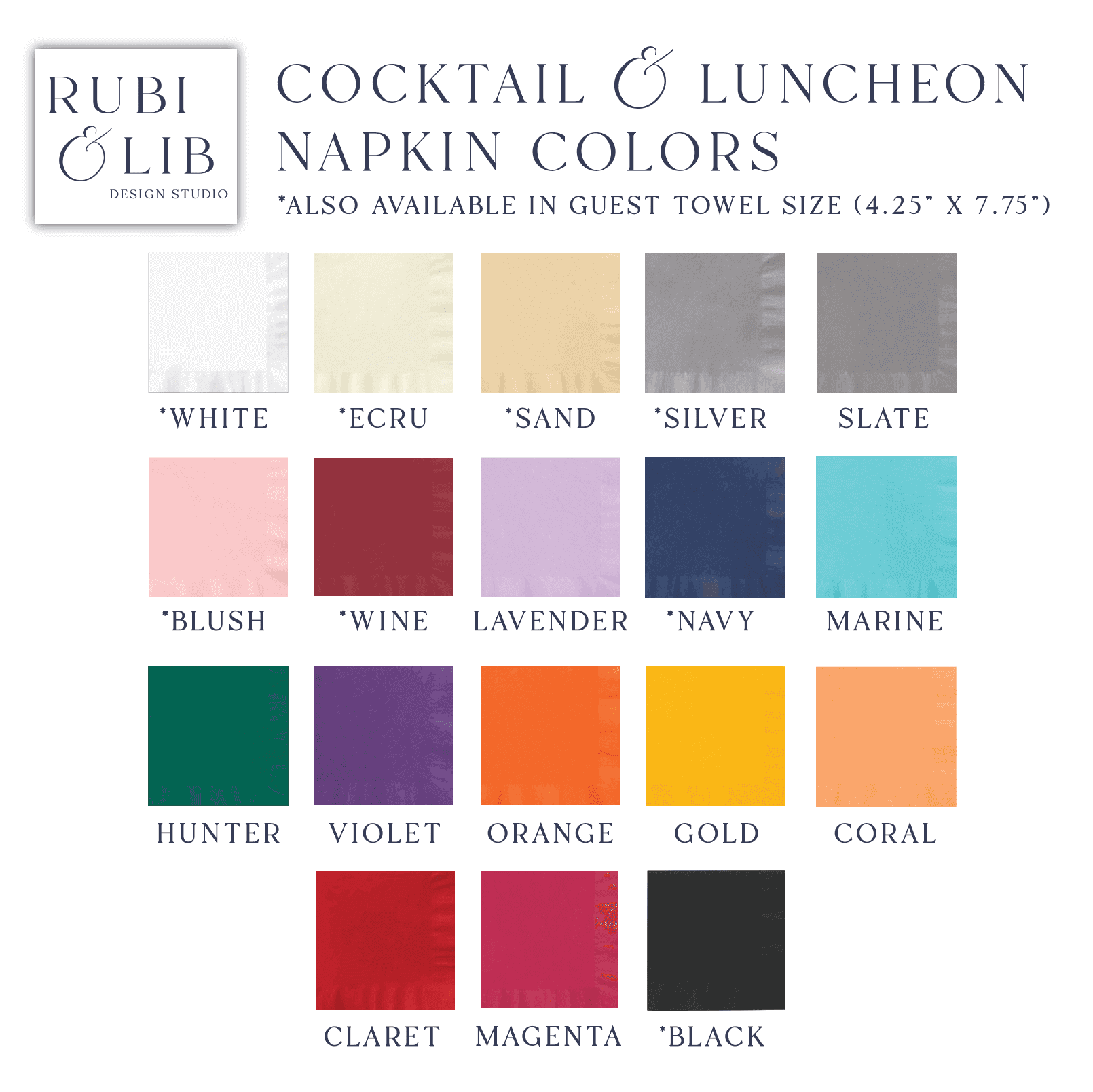 - Cocktail Napkins are approximately 4.75" x 4.75" and 5" x 5" (sizes vary by color)
