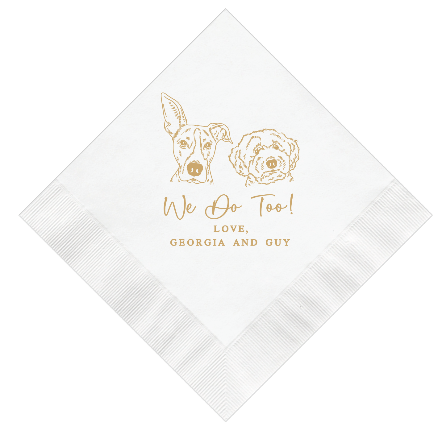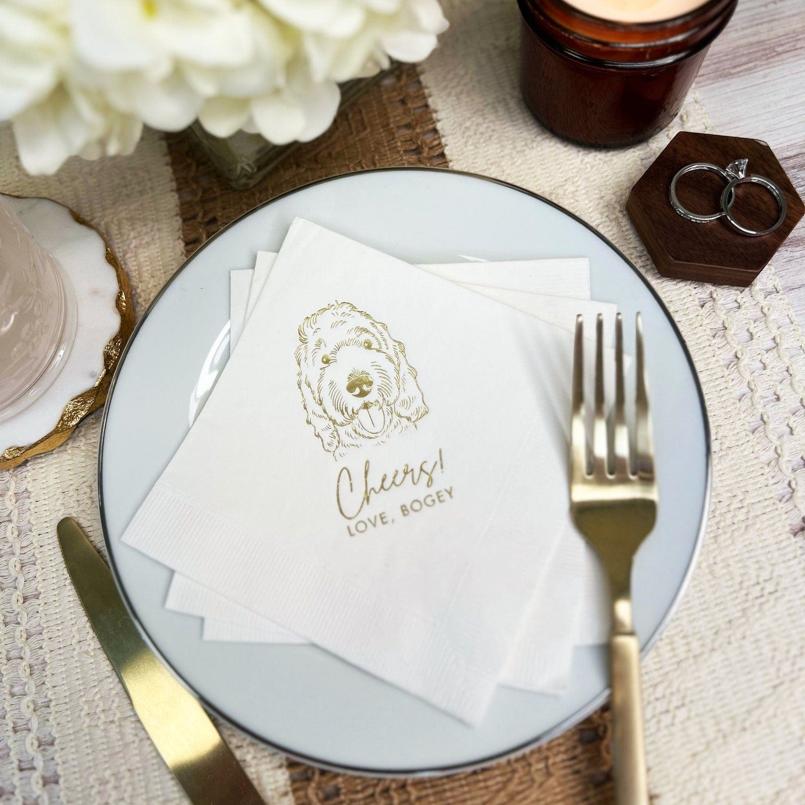 Sad that your favorite four legged baby can't be at your wedding? Add a fun personalized element to your wedding that features your favorite dog or cat. Choose from multiple napkin colors and foil imprint colors to make these napkins truly unique. These are professional printed in real foil (both shiny and matte options are available.) Scroll down to see all the napkin and foil colors that are available.