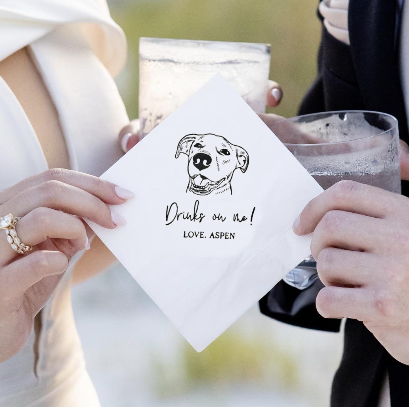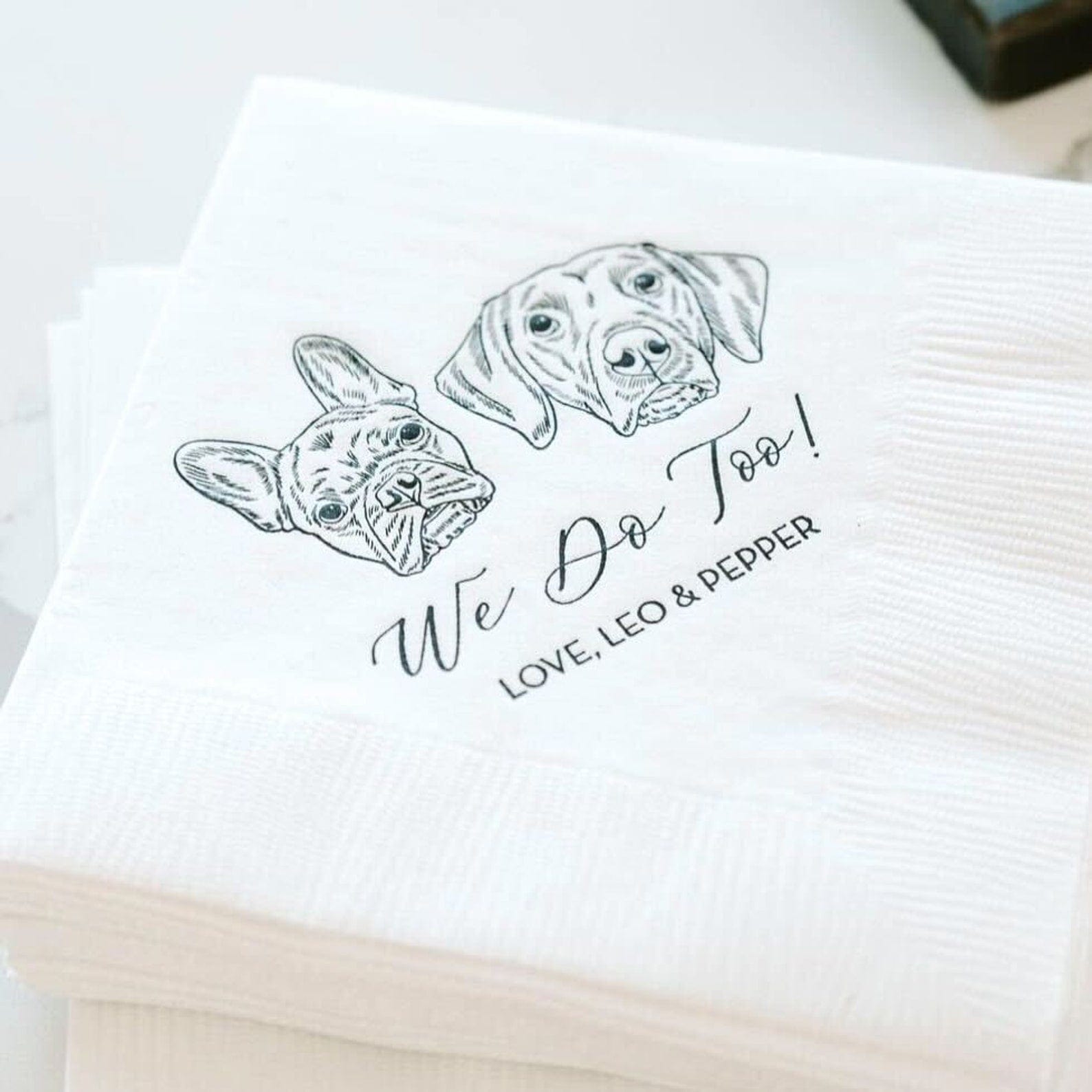 Sad that your favorite four legged baby can't be at your wedding? Add a fun personalized element to your wedding that features your favorite dog or cat. Choose from multiple napkin colors and foil imprint colors to make these napkins truly unique. These are professional printed in real foil (both shiny and matte options are available.) Scroll down to see all the napkin and foil colors that are available.
