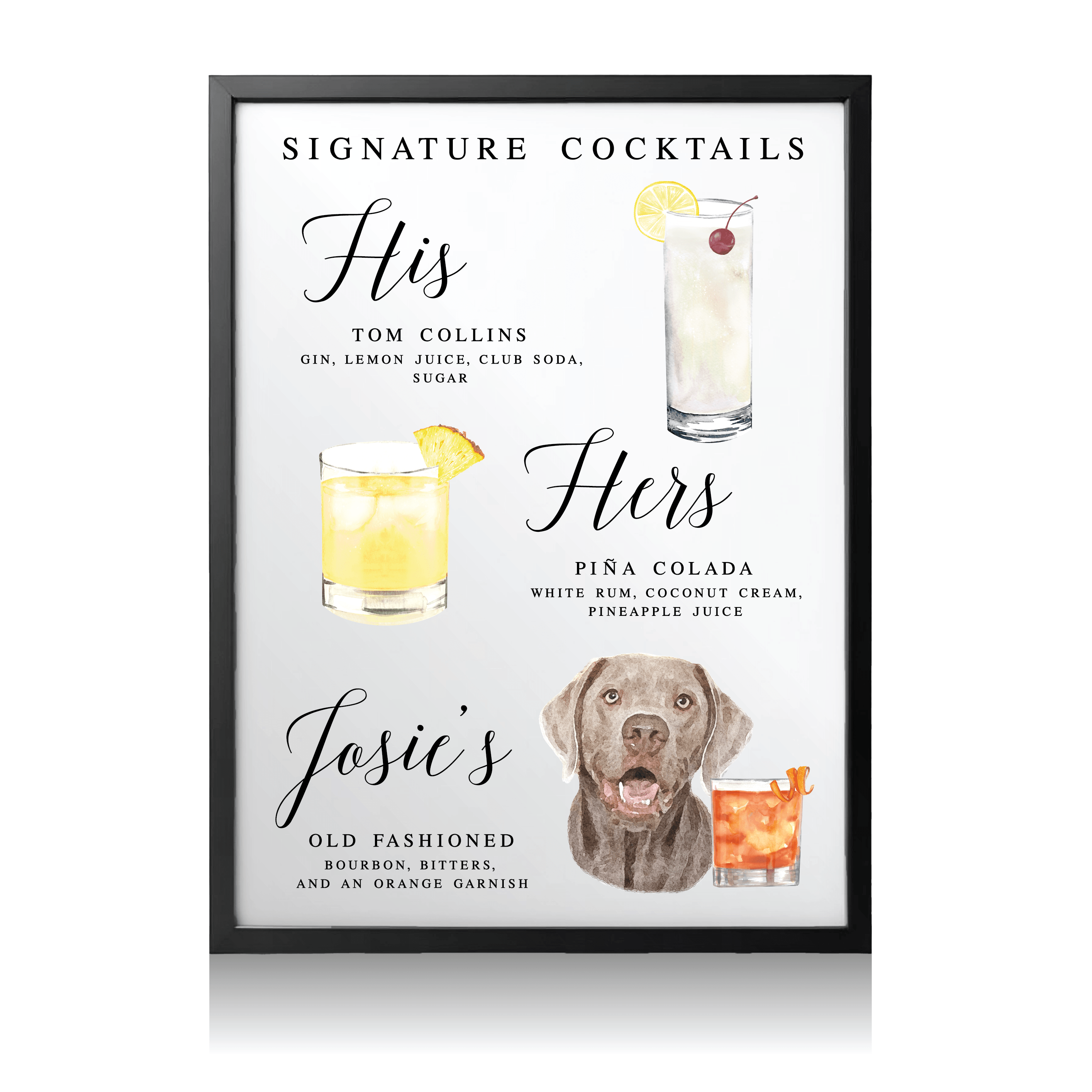 This is a perfect signature drink sign for a wedding or party. Add a special touch and include a likeness of your favorite four legged friend to your wedding reception bar.