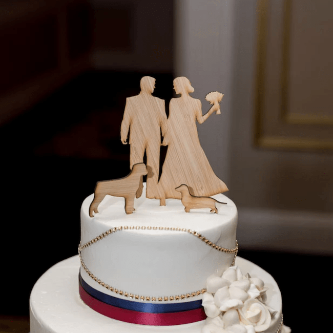 Please note that the dog breeds that are shown on the second photo will be how they look on the actual topper. The dog will come on it's own stake. This allows you to place the dog in any direction you want - face the dog towards the bride and groom or face it pointing outwards. You can even decide which side the dog will stand on (bride side or groom side). Just be sure to tell your baker what you would like when they place the topper on top of your cake.